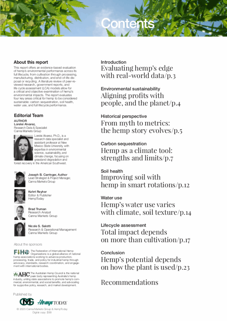 This report offers an evidence-based evaluation of hemp’s environmental performance across its full lifecycle, from cultivation through processing, manufacturing, distribution, and end-of-life disposal or recycling. A literature review of peer-reviewed research, government reports, and life cycle assessment (LCA) models allow for a critical and objective examination of hemp’s environmental impacts. The report evaluates four key areas critical for hemp to be considered sustainable: carbon sequestration, soil health, water use, and full lifecycle performance.